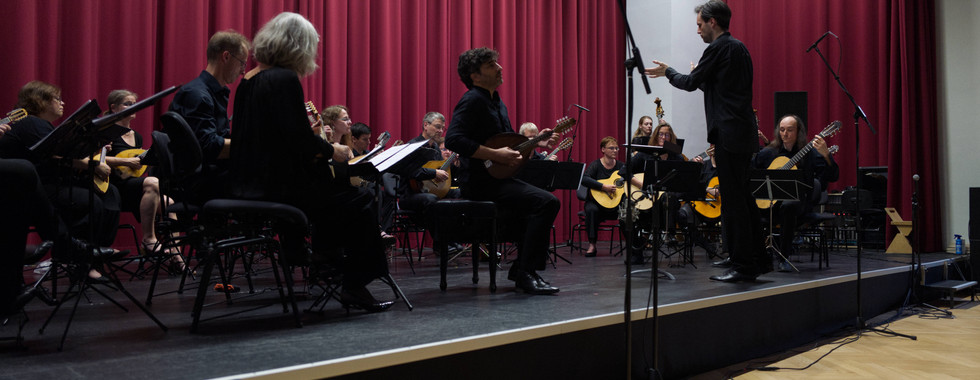 Aber der Reihe nach: Den Auftakt des Konzertes machte das Badische Zupforchester mit einem Werk von Hans Gál, der Sinfonietta Nr. 1 in A-Dur, die äußerst selten zu hören ist, da sie ans spieltechnische und musikalische Können des Orchesters wie auch an die Hörgewohnheiten des Publikums große Anforderungen stellt: ein wahrlich symphonisches Werk, im Bereich der Zupfmusik fast solitär. Gál komponierte es im schottischen Exil 1961 original für Zupforchester. Im Konzertsaal war spürbar, dass sich das Badische Zupforchester mit der Musik von Hans Gál intensiv beschäftigt hatte. Christopher Grafschmidt, der das Konzert gewohnt charmant moderierte, kündigte im Anschluss sein eigenes Werk „Schnipseljagd“ an, eine Collage, die ausschließlich aus Zitaten besteht und in der, wie er betonte, keine einzige Note von ihm selbst stammt! Dem Publikum hat dieses „stilistische Kuddelmuddel“, wie es Grafschmidt selbst bezeichnete, sehr gut gefallen.
